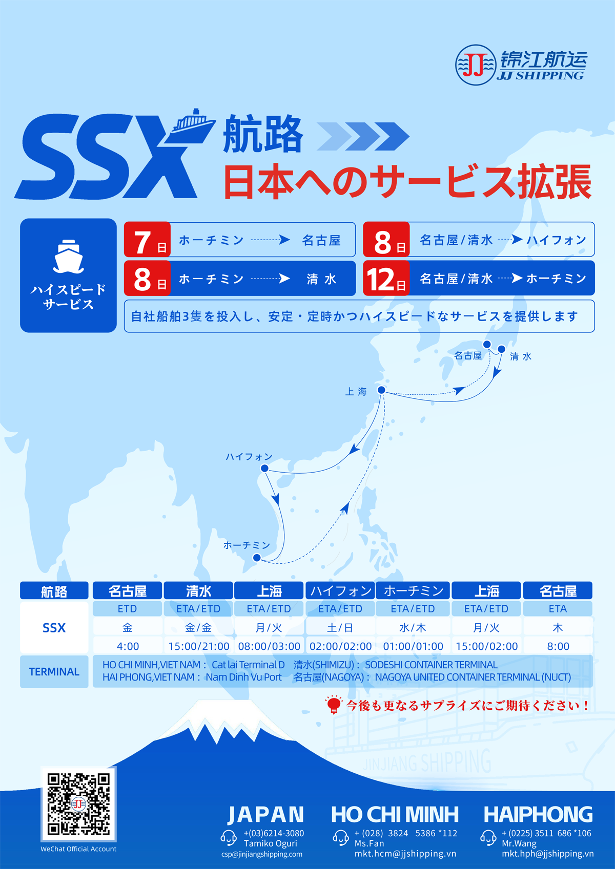 このたび弊社では、名古屋・清水とハイフォン・ホーチミンを直行で結ぶ新規航路を開設いたしました。お客様の利便性向上と輸送効率化に貢献すべく、スピードと信頼性のあるサービスを提供いたします。
